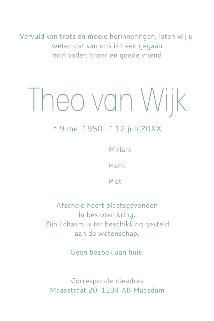 Een prachtige rouwbrief met duif. Deze rouwkaart kunt u oppakken en bewerken in de editor. Plaats de naam em voeg persoonlijke teksten toe.
