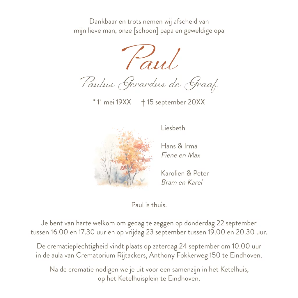 Een rouwkaart voor een man die hield van de natuur en het bos