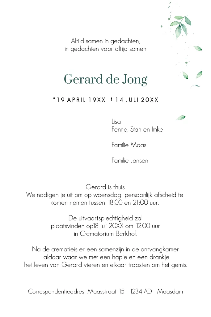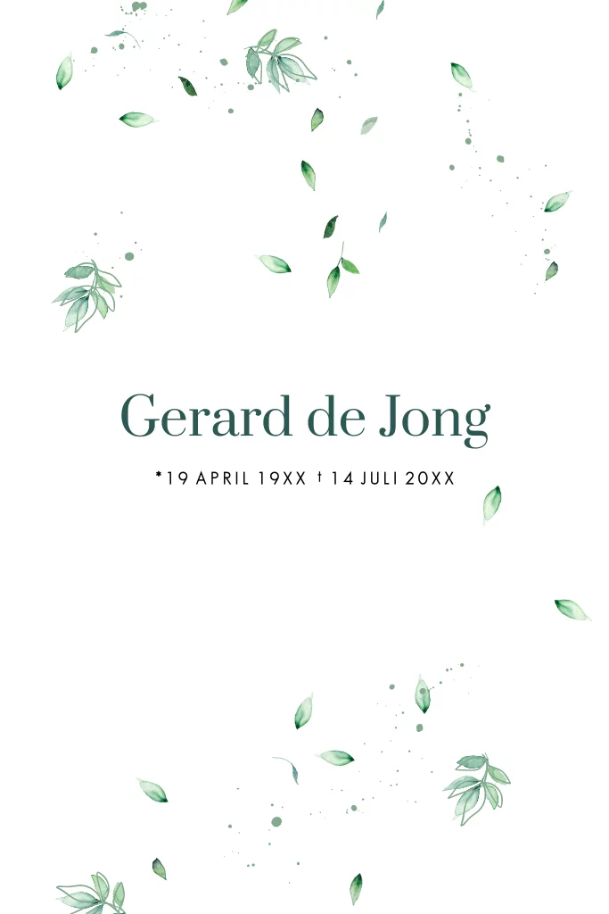 Een mooie uitnodiging om samen met dierbaren afscheid te nemen van de overledene. Prachtig kleine vallende blaadjes dwarrelen om de naam.