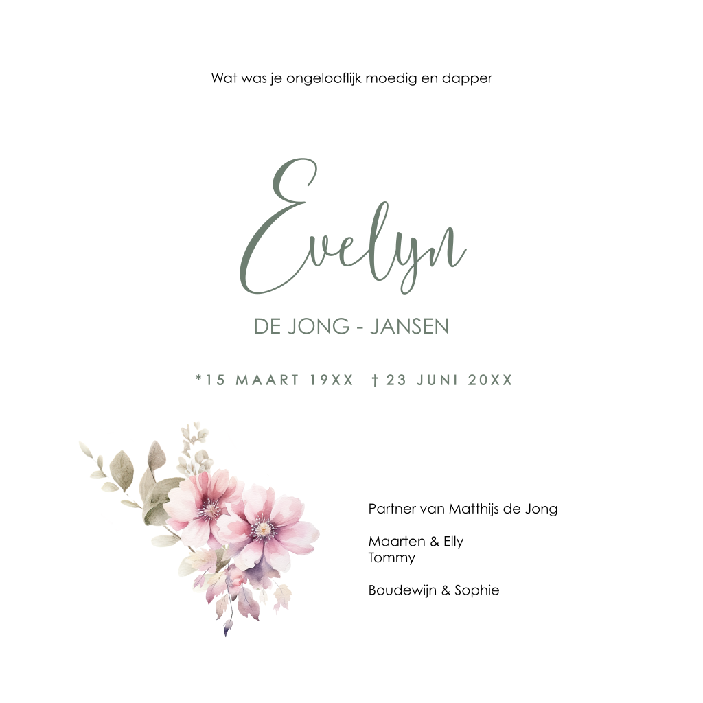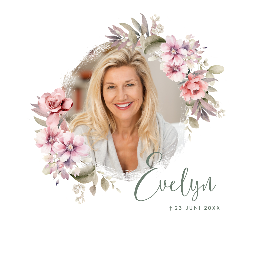 Kies voor deze prachtige rouwkaart met portretfoto in een krans van veldbloemen. Vervang de foto eenvoudig in de editor.