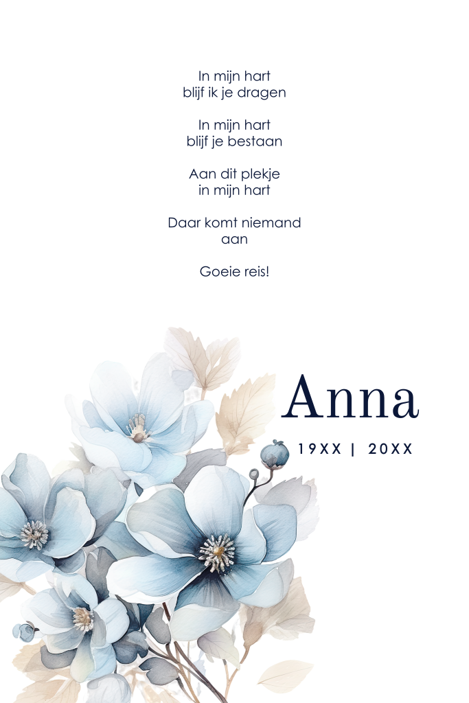 Rouwkaart vrouw met zachtblauwe bloemen en gedicht | DAGLIEF