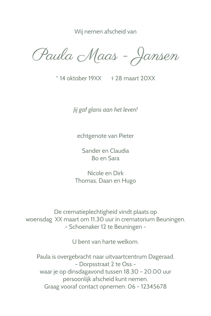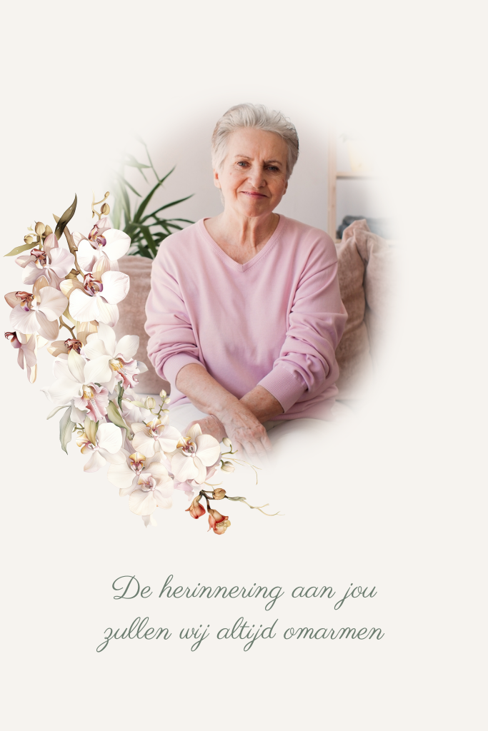 Prachtige rouwkaart orchidee met aan de binnenzijde voldoende ruimte voor een foto, mooie woorden en de uitnodiging voor de uitvaart.