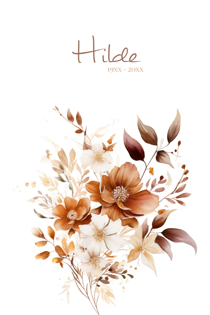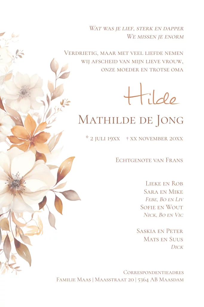 Rouwkaart met warme kleuren en zachte bloemen. Personaliseer eenvoudig in onze editor voor een passend afscheid van je dierbare.