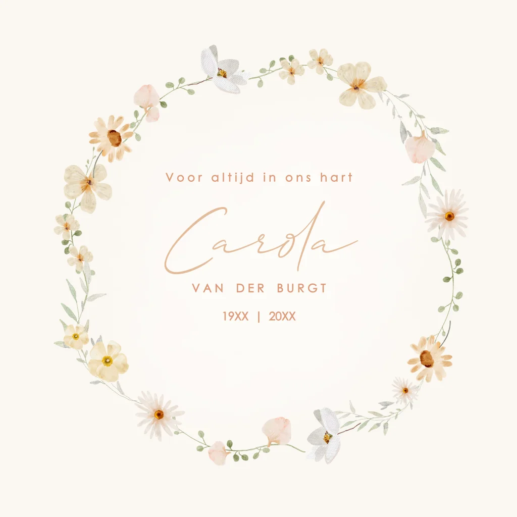 Kies voor deze prachtige rouwkaart met prachtige bloemenkrans. Vervang aan de binnenzijde de foto en maak een unieke kaart voor het afscheid.
