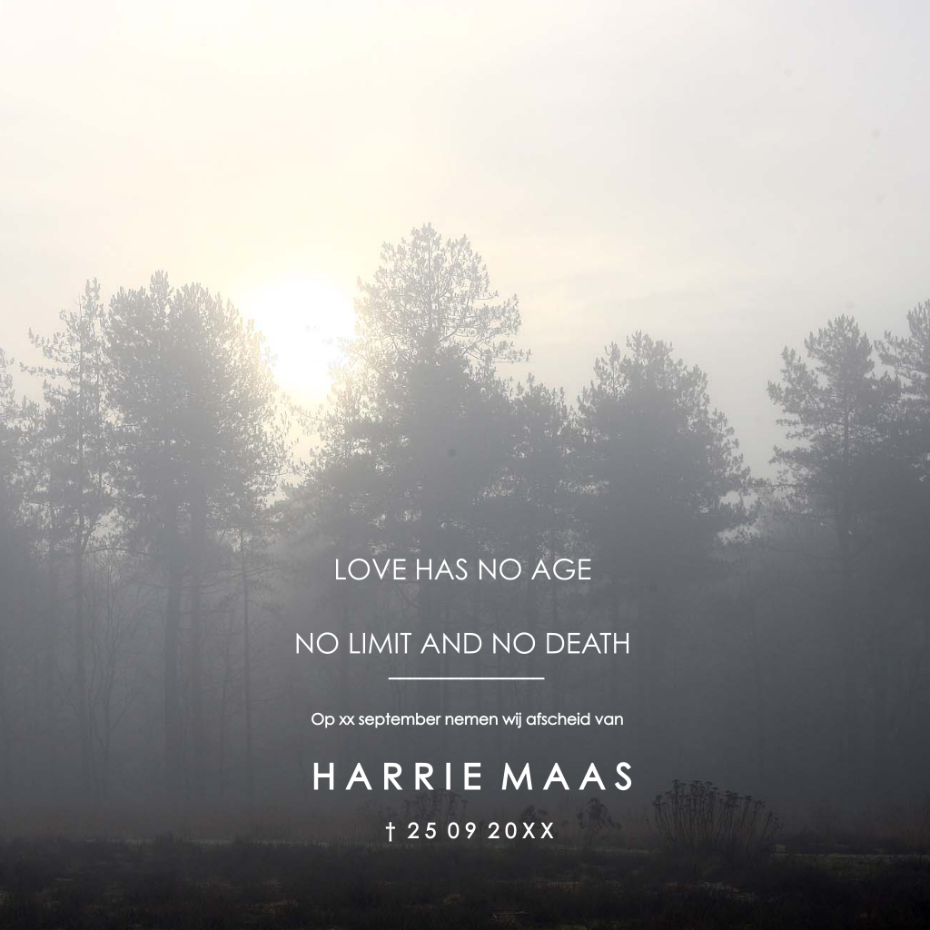 Ontwerp een mooie rouwkaart met mistig bospot en tekst 'Love has no age, no limit and no death'. Zelf rouwkaart maken online.