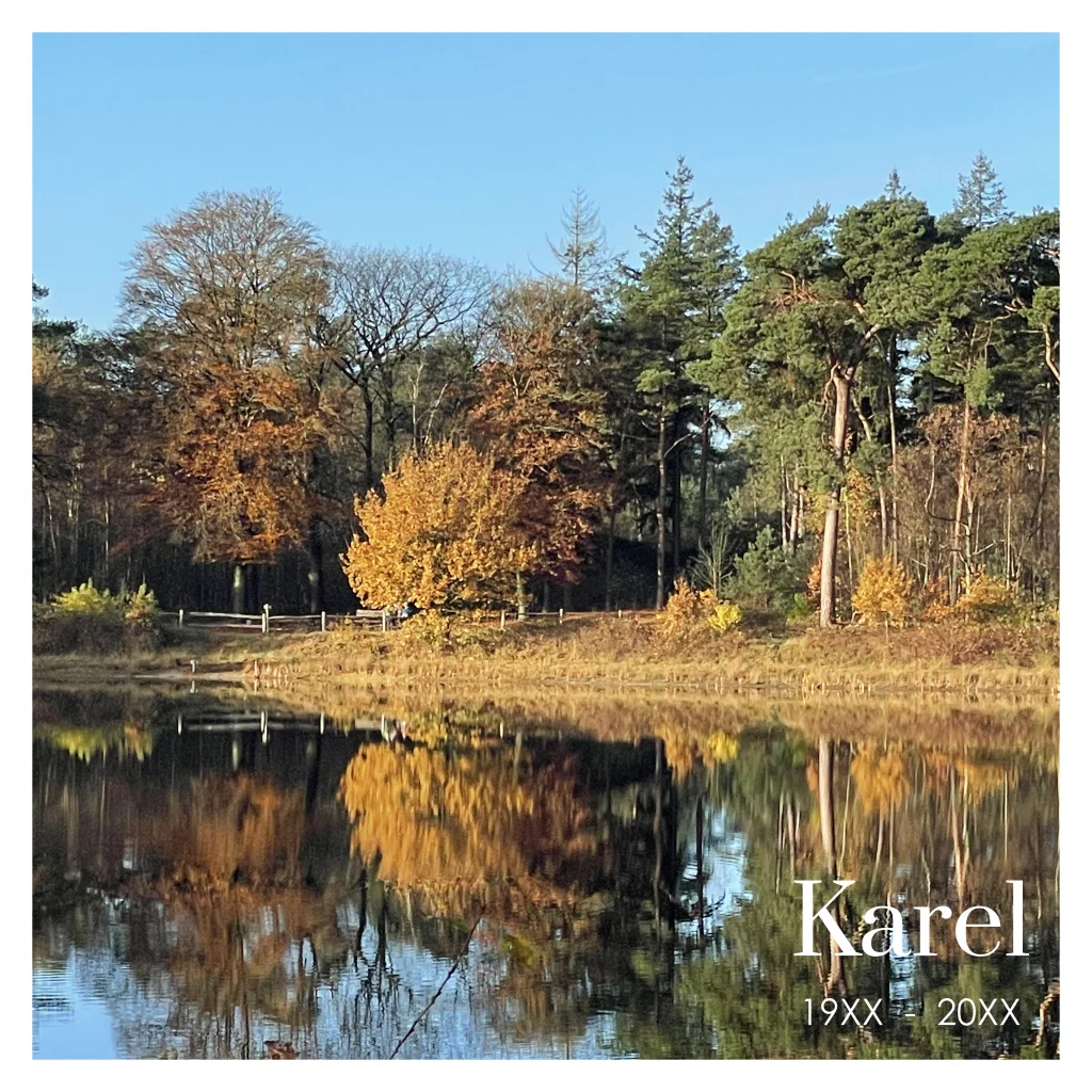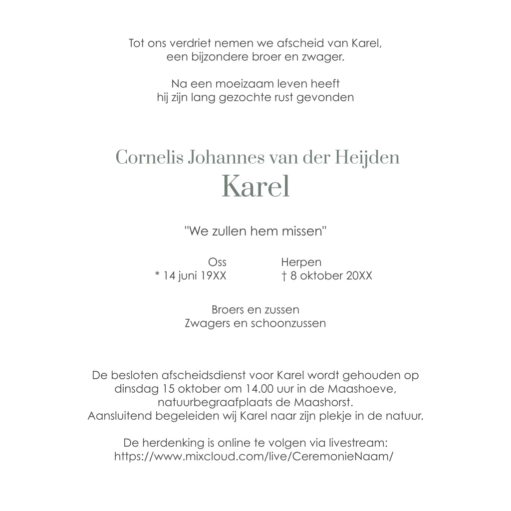 Een prachtig landschap met boom en bos. Deze rouwkaart past erg mooi bij een uitvaart op een natuurbegraafplaats.