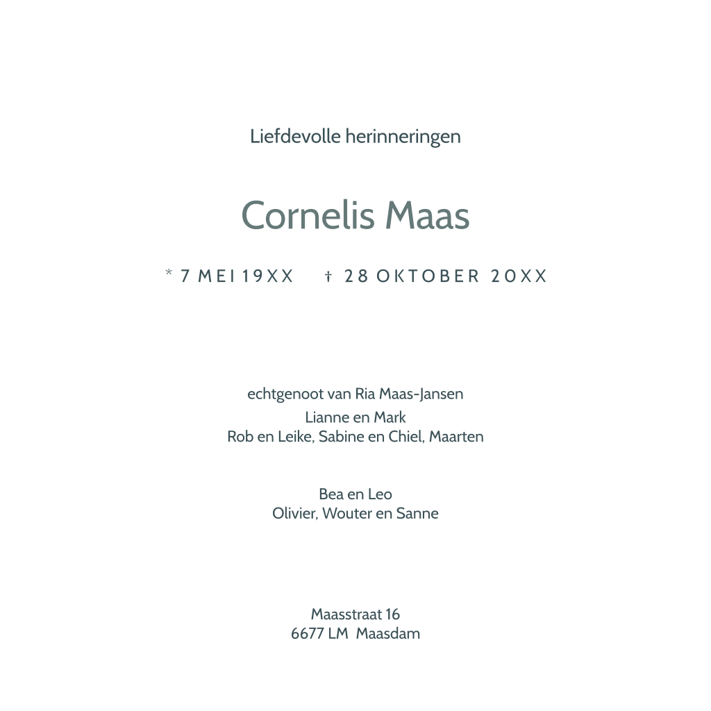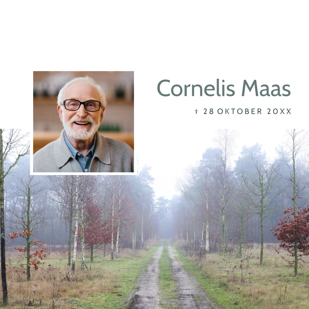 Een persoonlijke rouwkaart met een foto van de overledene, gecombineerd met een mistig boslandschap. De rustige sfeer van het ontwerp biedt troost en herdenkt een geliefde met waardigheid en warmte.