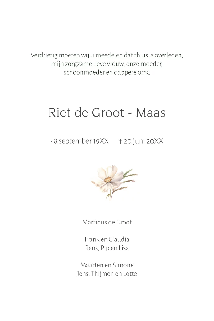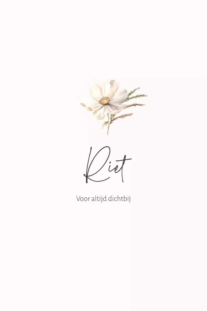 In deze rouwkaart is gewerkt met mooie aquarel bloem. Het ontwerp is stijlvol en klassiek, de tekst is eenvoudig aan te passen.