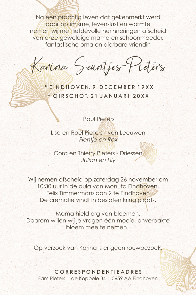 Een prachtige rouwkaart met een modern ontwerp met vallen de blaadjes en stijlvolle typografie.