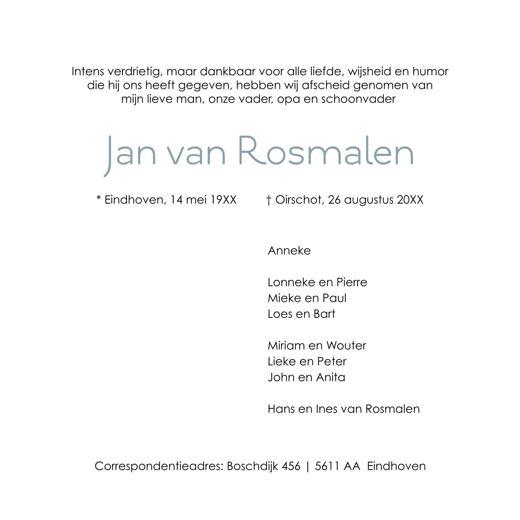 Maak een persoonlijke rouwkaart bij Daglief. Een kaart die familie en vrienden als een blijvende herinnering zien.