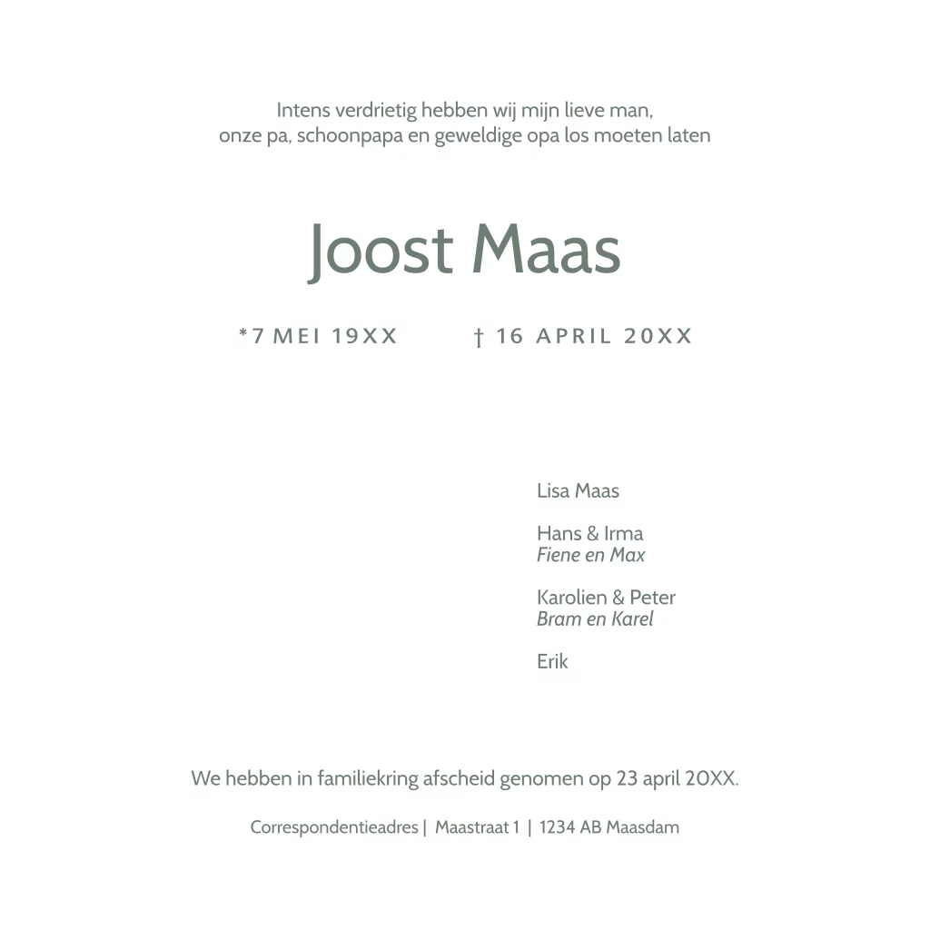 Met persoonlijke foto's en dit handige stramien maak je eenvoudig een persoonlijke rouwkaart. Pak de kaart op en bewerk in de editor van Daglief.