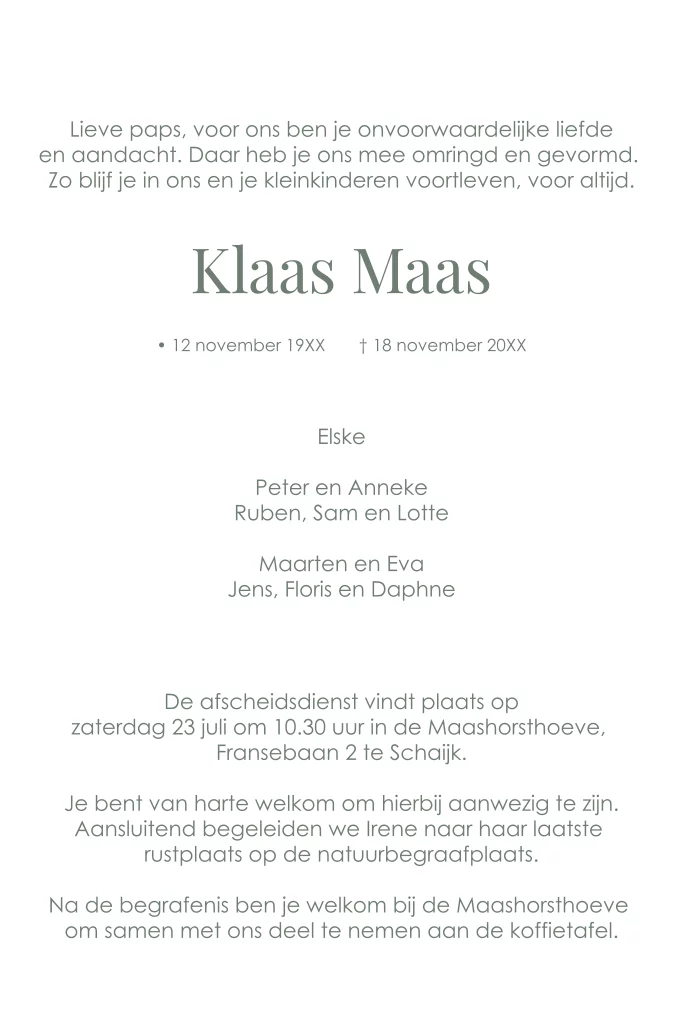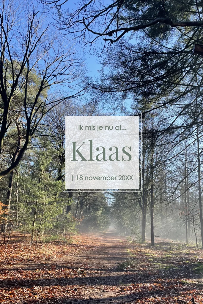 Ontwerp zelf online een stijlvolle kaart en bestel eenvoudig rouwkaarten met mistig bospad. Maak een persoonlijke uitnodiging voor het afscheid.