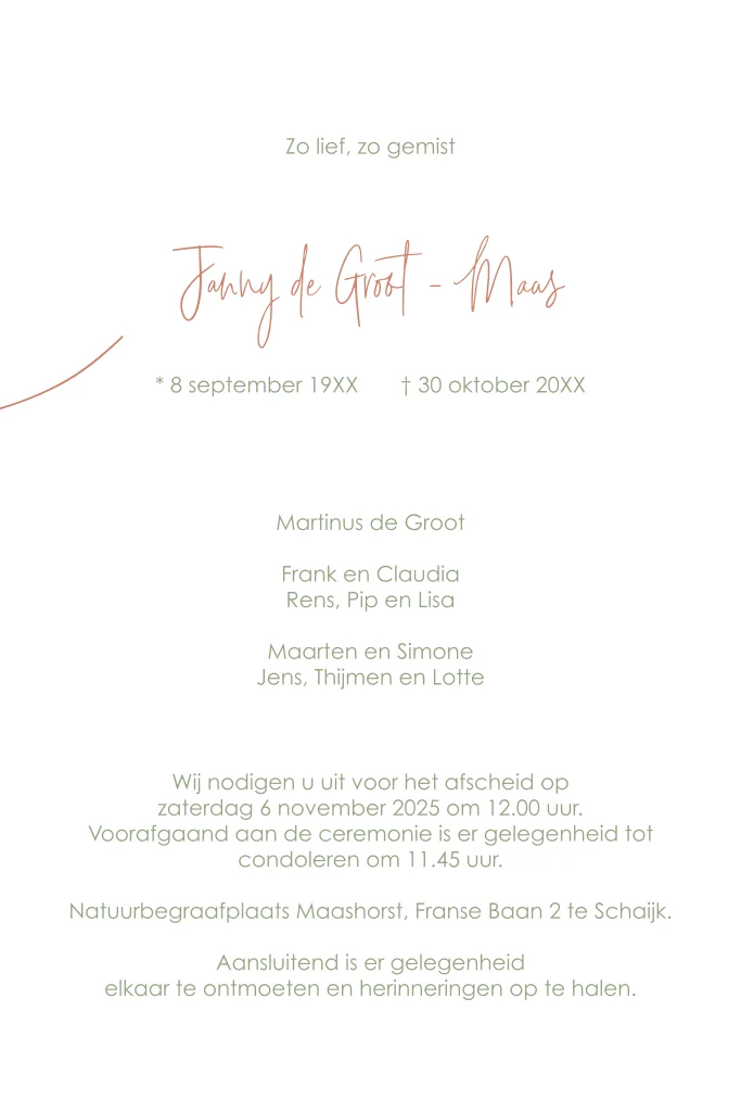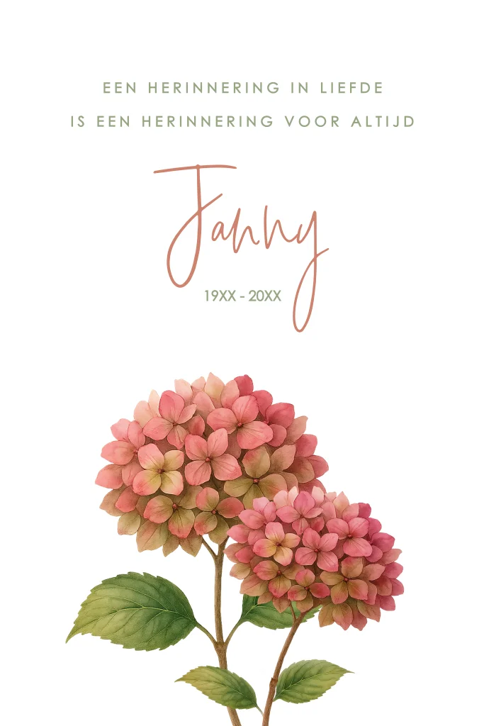 Ontwerp een stijlvolle rouwkaart met aquarel hortensia. Zacht, troostrijk en passend bij een liefdevol afscheid. Direct online te maken.