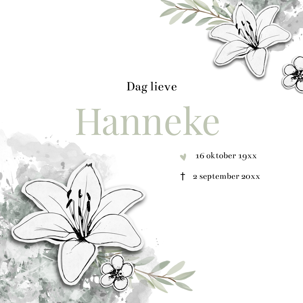 Rouwkaart met getekende lelie, zwart-wit en groene accenten