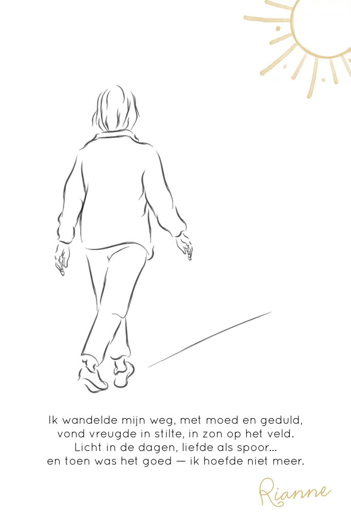 Verstilde rouwkaart met lijnillustratie van een wandelende vrouw, zonnestraal en troostrijk gedicht. Liefdevol vormgegeven, kies voor een luxe papiersoort.