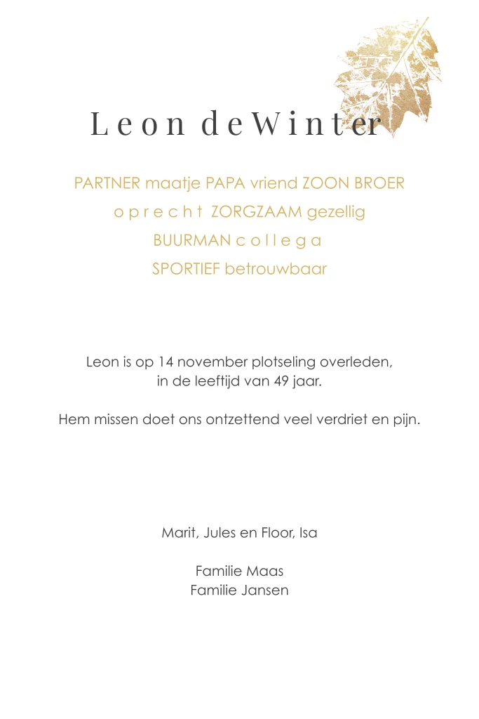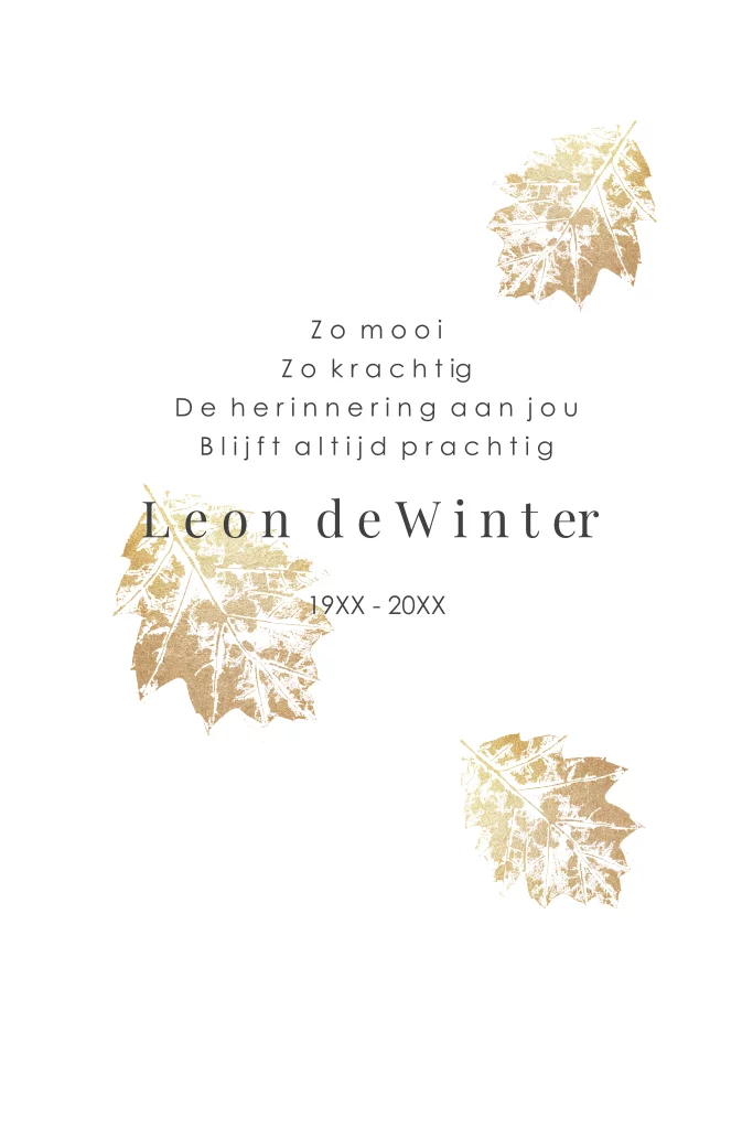 Laat de rouwkaart een weerspiegeling zijn van jullie dierbare. Met deze warme kleuren belicht je niet alleen het afscheid, maar laat je ook de mooie herinneringen spreken.