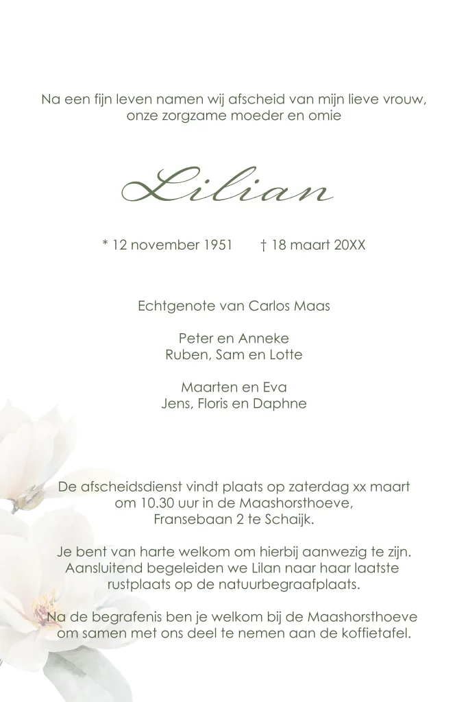 Kies voor deze rouwkaart met magnolia in zachte tinten. De kaart heeft een eigentijdse en warme uitstraling.