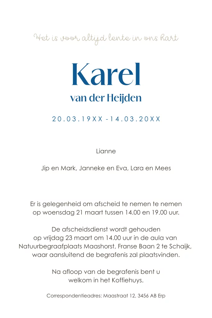 Een rouwkaart voor een man in de bloei van zijn leven... voor altijd lente in ons hart. Mooi met de eco tulp envelop.