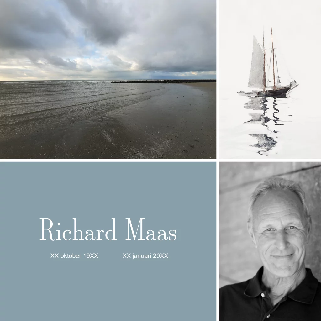 Collage rouwkaart met zee, zeilschip en portretfoto