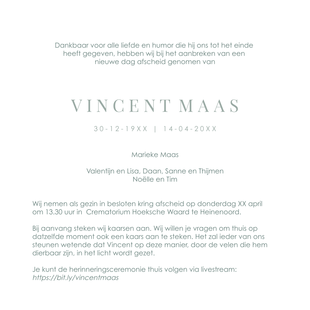 Een persoonlijke rouwkaart met woorden die de overledene typeren. In de online editor kun je zelf de woorden veranderen en opnieuw positioneren..