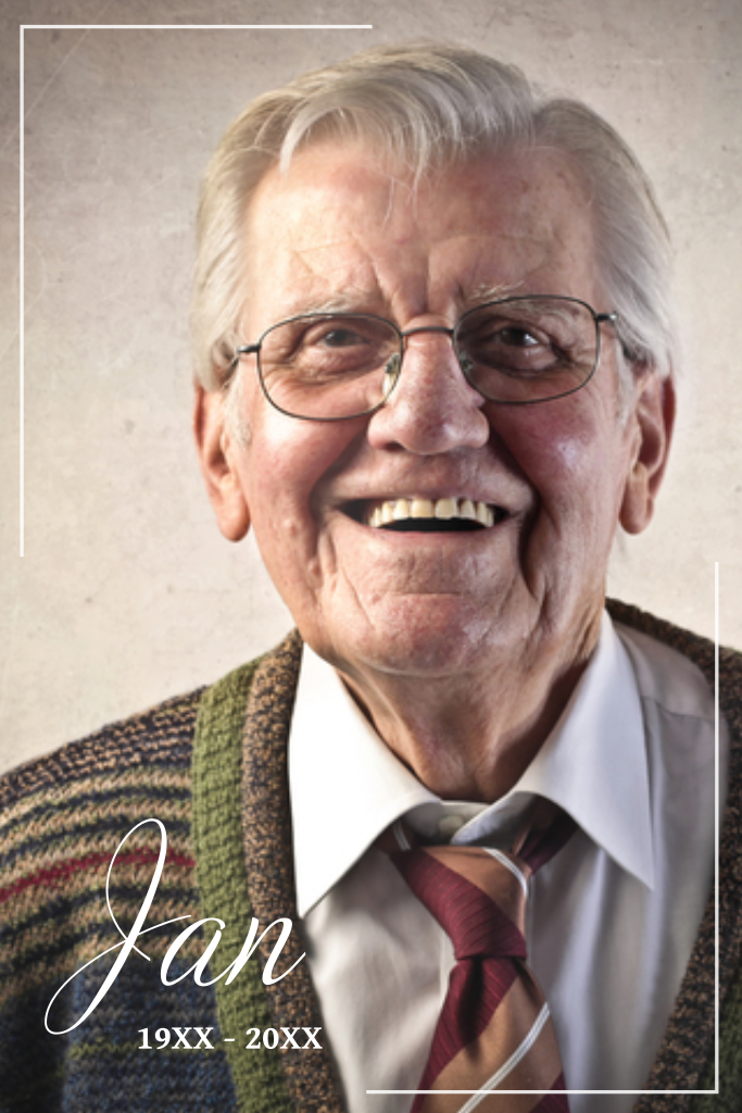 Kies voor deze klassieke rouwkaart man met foto in kader. Naam en data zijn eenvoudig aan te passen. Klik en bewerk in de editor.