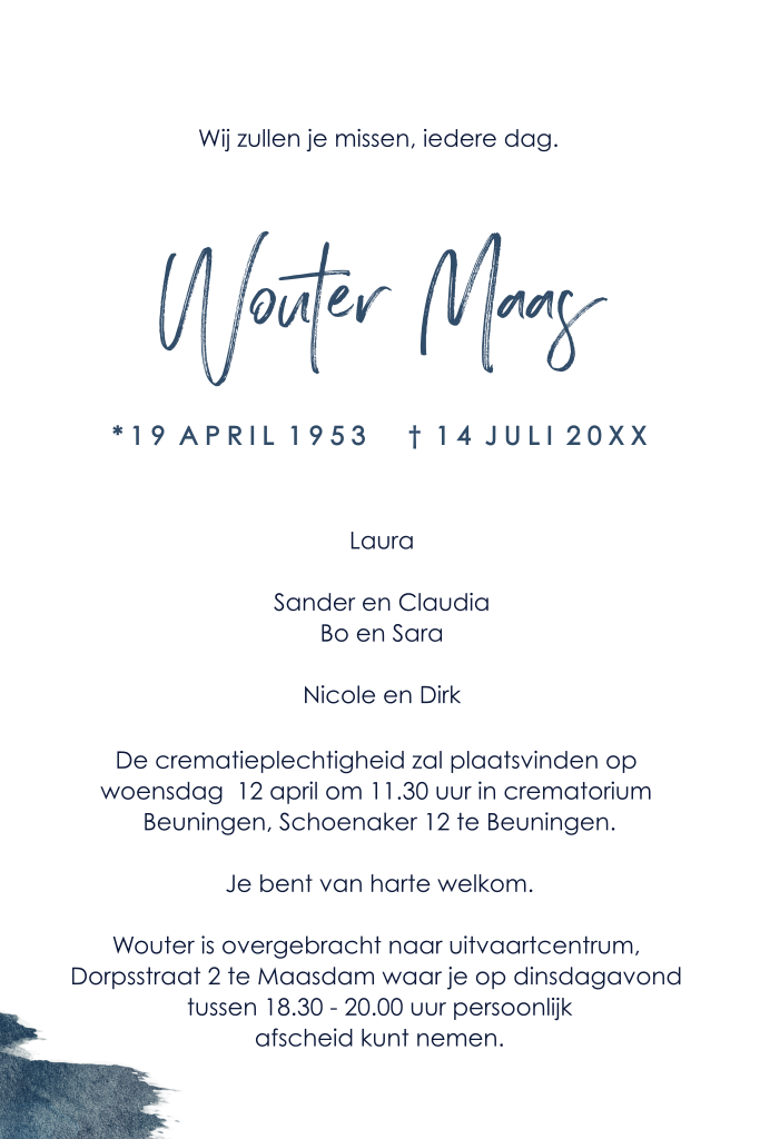 Een moderne rouwkaart met water colour in donkerblauw. De kleur staat voor een stoere persoonlijkheid.