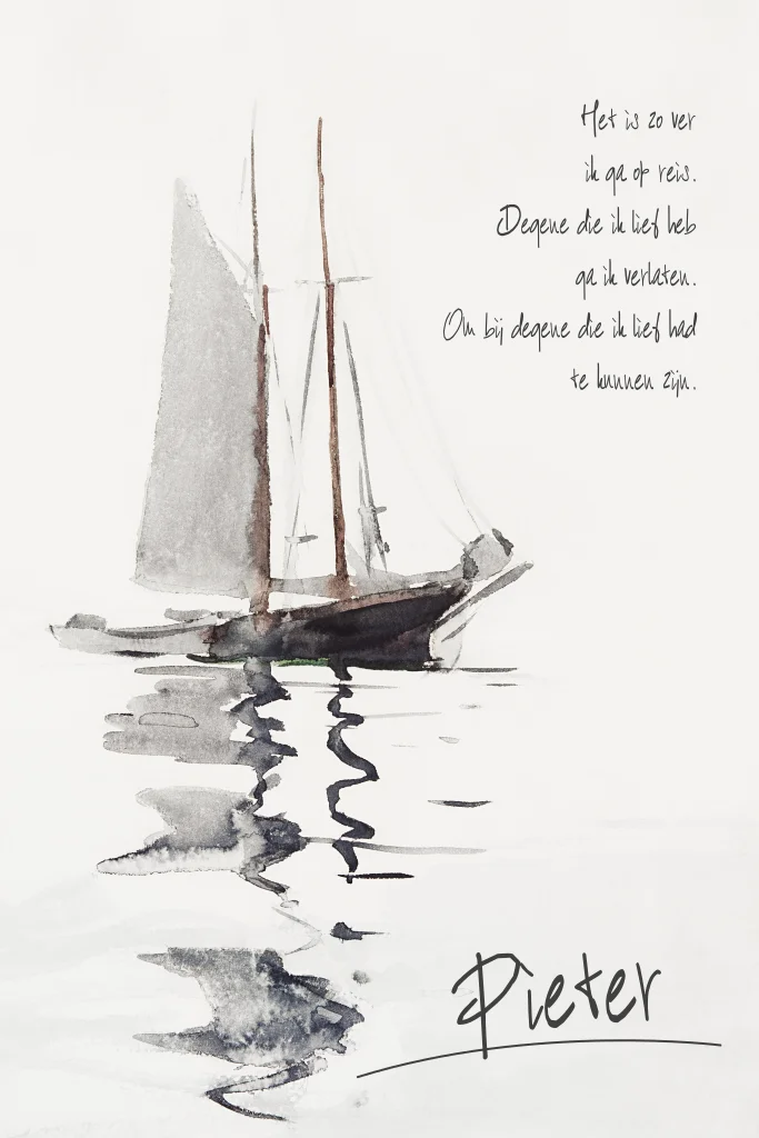 Rouwkaart met zeilboot in aquarel met gedicht ik ga op reis