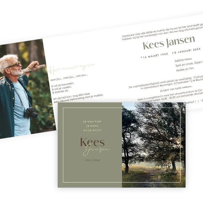 Een elegante rouwkaart met een rustig boslandschap en de tekst 'je was niet, je bent en je blijft.' Dit ontwerp straalt rust en een tijdloze herinnering uit.