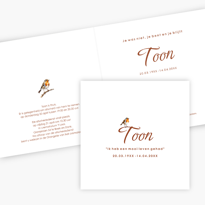 Kies voor deze prachtige rouwkaart met naam en roodborstje. Het vogeltje plaats je eenvoudig op de plek waar jij deze wil hebben.