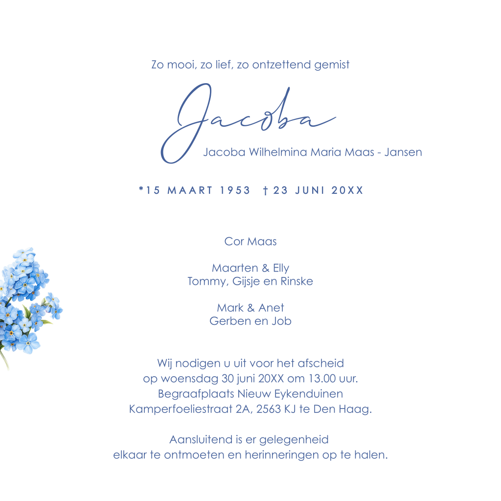 Een lieve rouwkaart met de sprekende blauwe kleur van de vergeet me nietjes. De naam van de bloemen zegt al heel veel.