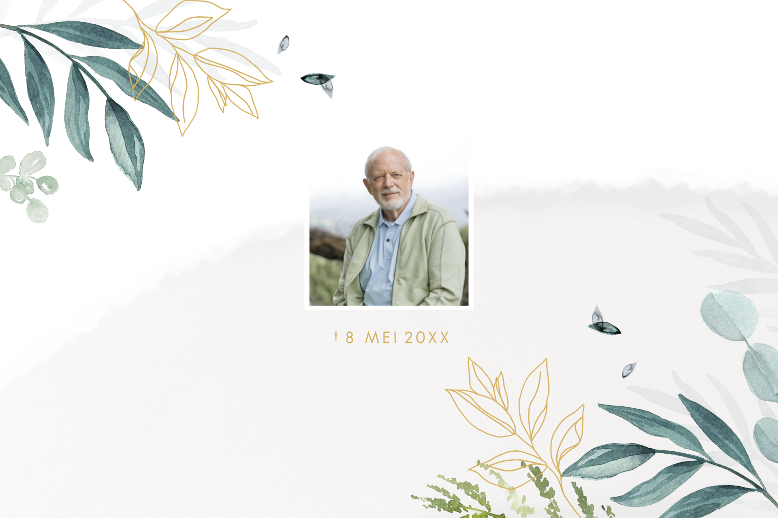 Botanische rouwkaart met foto. Door het vervangen van de foto, de kleur te wijzigen van de watercolour en een passend lettertype te kiezen maak je eenvoudig een unieke en persoonlijke kaart.