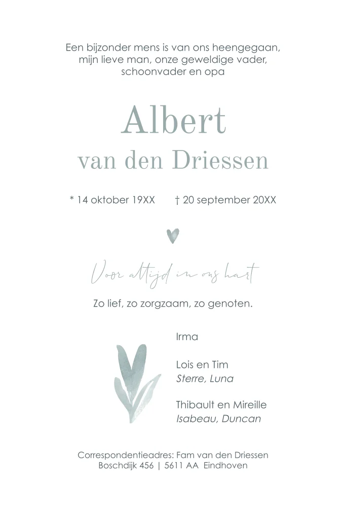 Maak een persoonlijke rouwkaart met foto. Een kaart om te herinneren. Vervang in de editor eenvoudig de foto en plaats je tekst.