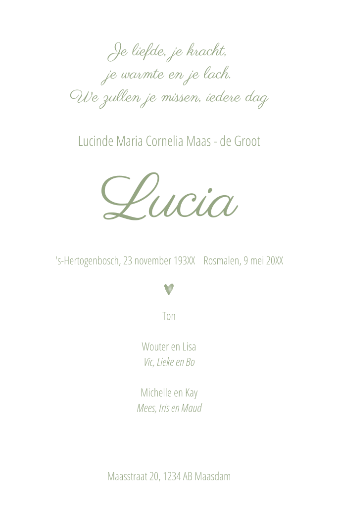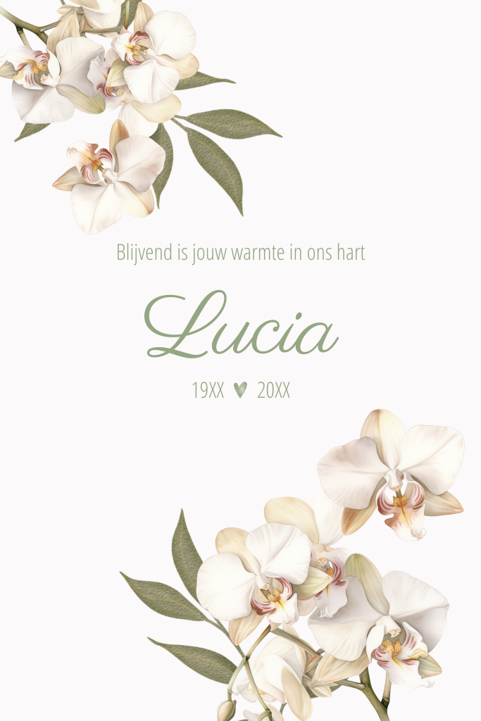 Prachtige rouwkaart met groene takjes en getekende orchideeën.