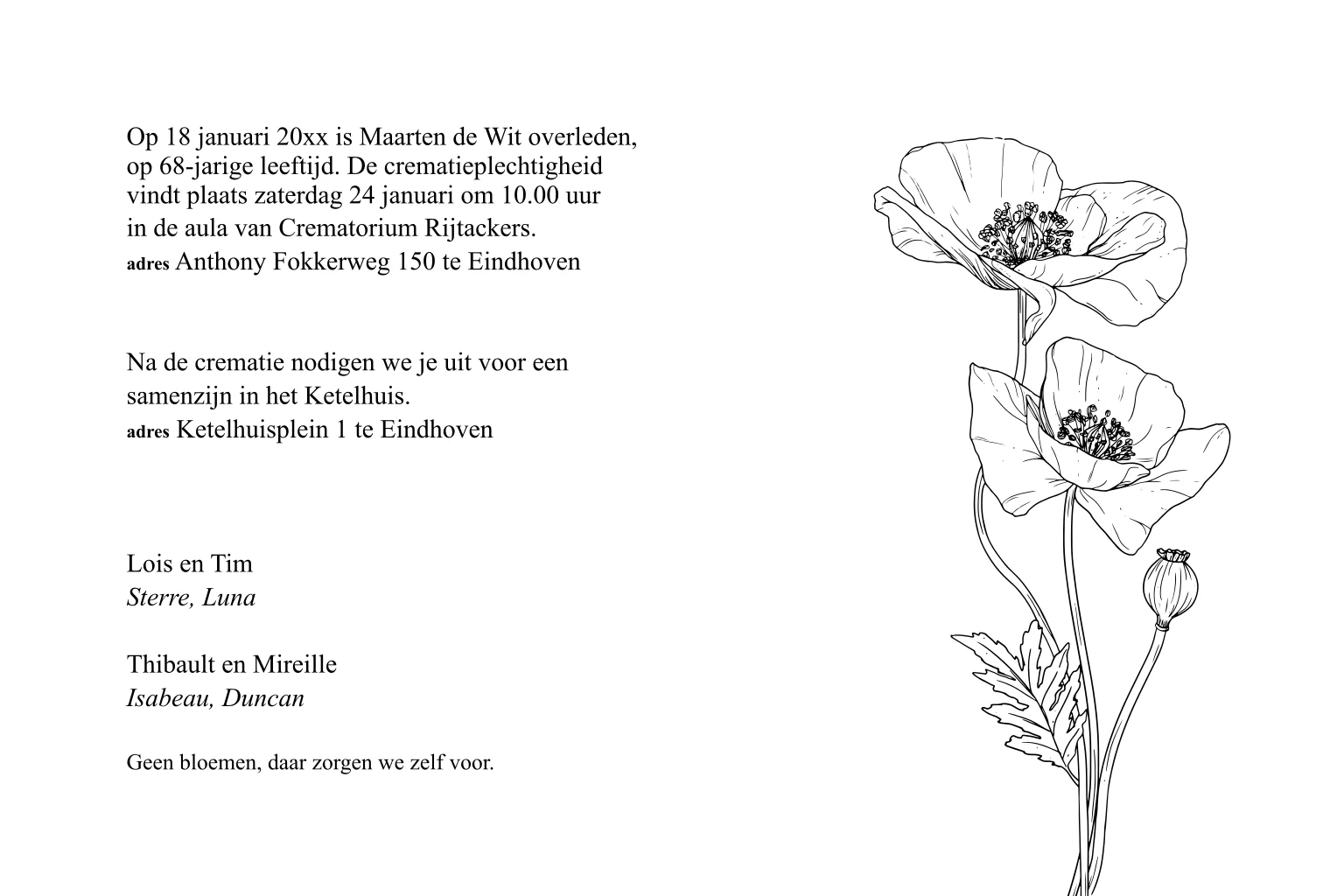 Een minimalistische rouwkaart met een verfijnde lijntekening van klaprozen. Een ingetogen en stijlvolle keuze om een dierbare te herdenken.