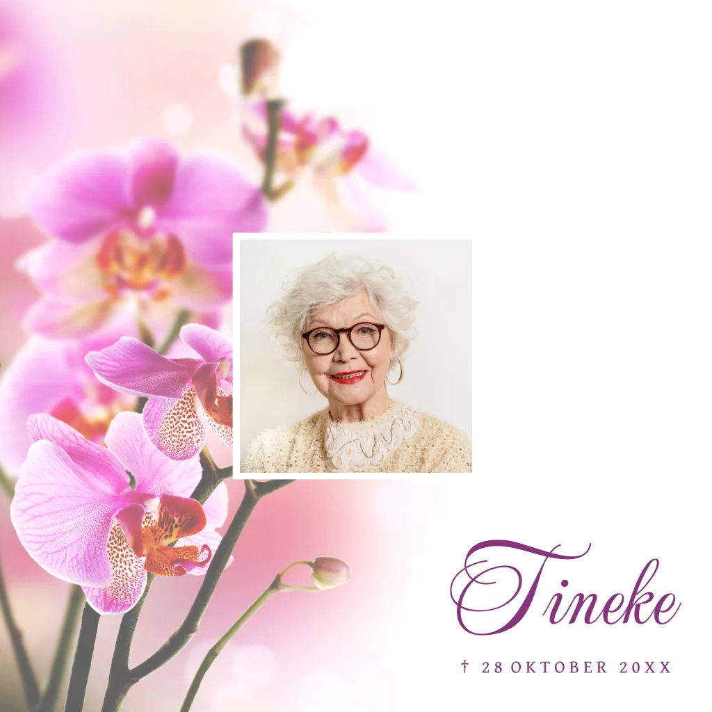 Kies voor de uitnodiging van je dierbare haar lievelingsbloem op de rouwkaart. Hier is gekozen voor een roze orchidee.