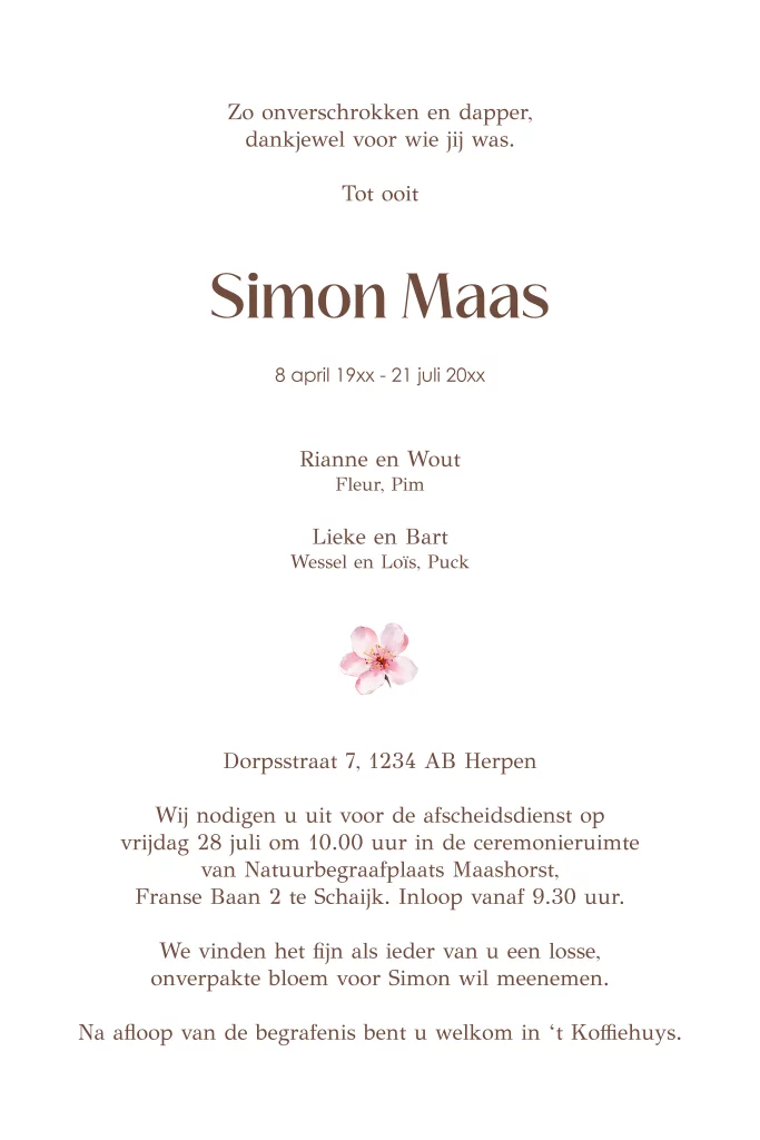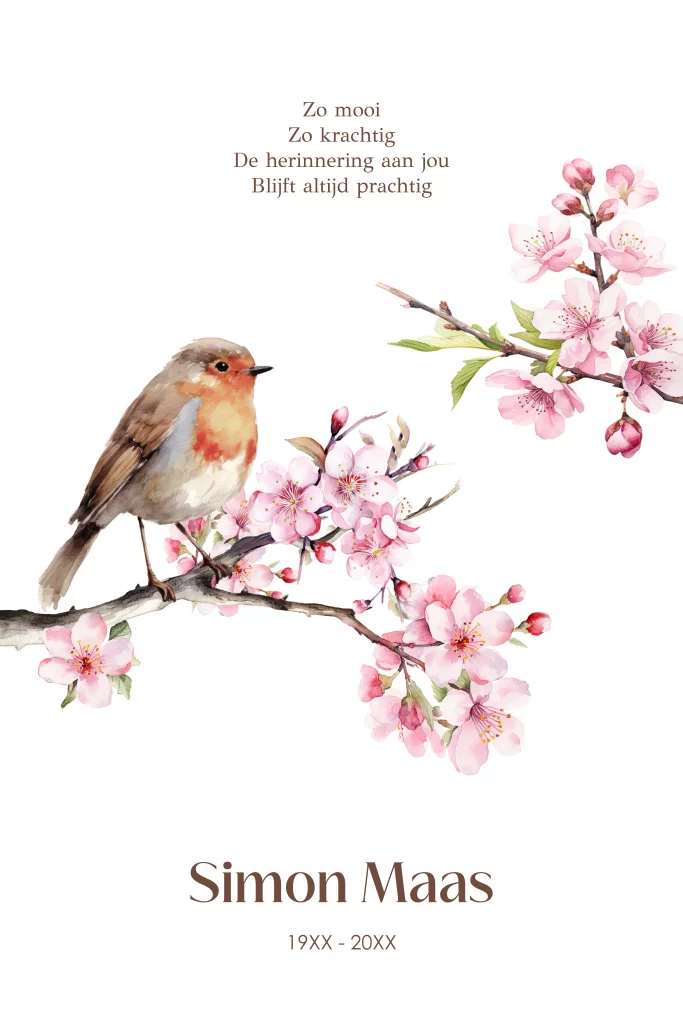 Een liefdevolle rouwkaart met een sierlijk roodborstje en bloesemtakken. Symbool van warmte, herinnering en troost.