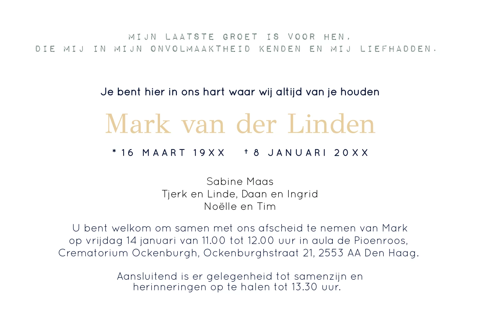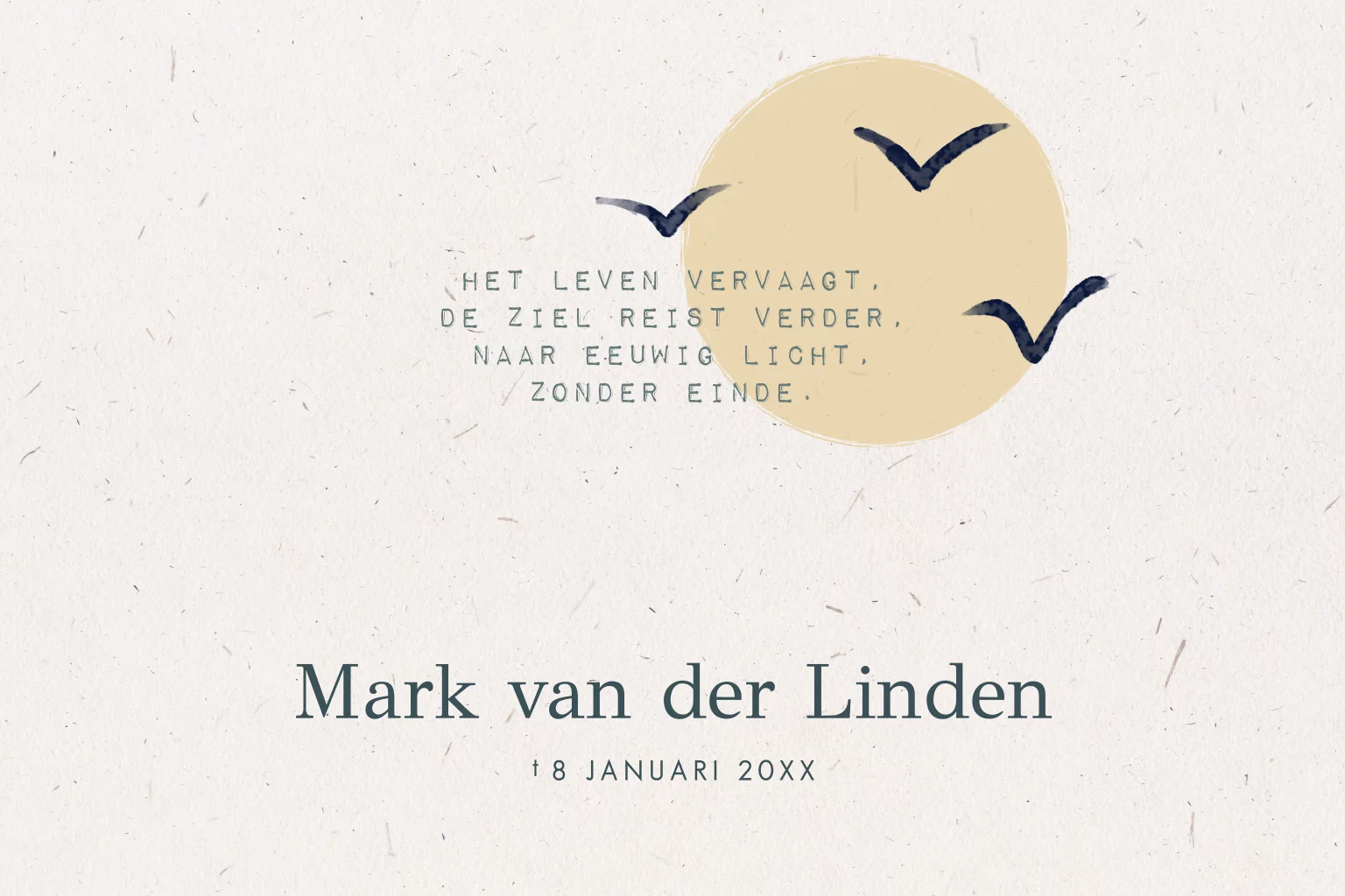 Een stijlvolle rouwkaart met een minimalistisch ontwerp van een zon en vogels. De zachte tinten en poëtische tekst stralen rust en verbondenheid uit.