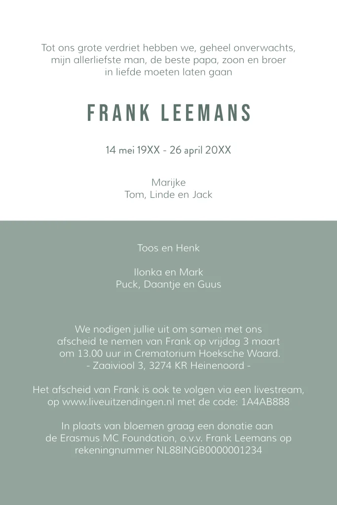 Maak samen met je familie een rouwkaart die past bij het karakter van je dierbare. Aandacht voor details, stoere tonen en gebruik van de bijpassende letterfonts.