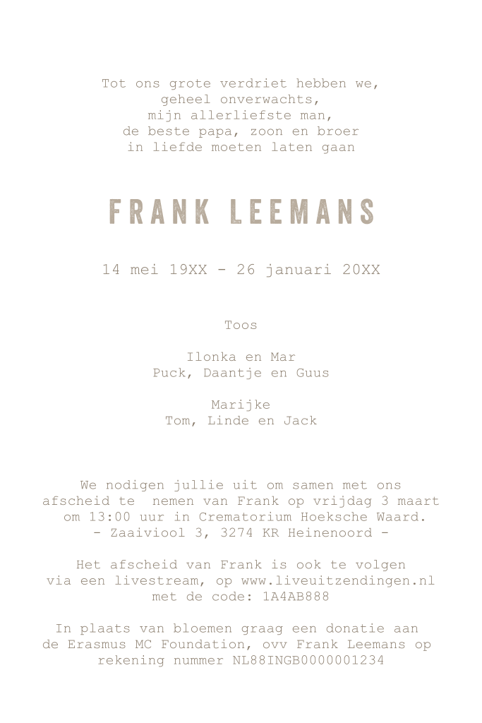 Maak samen met je familie een rouwkaart die past bij het karakter van je dierbare. Aandacht voor details en ingetogen tonen.