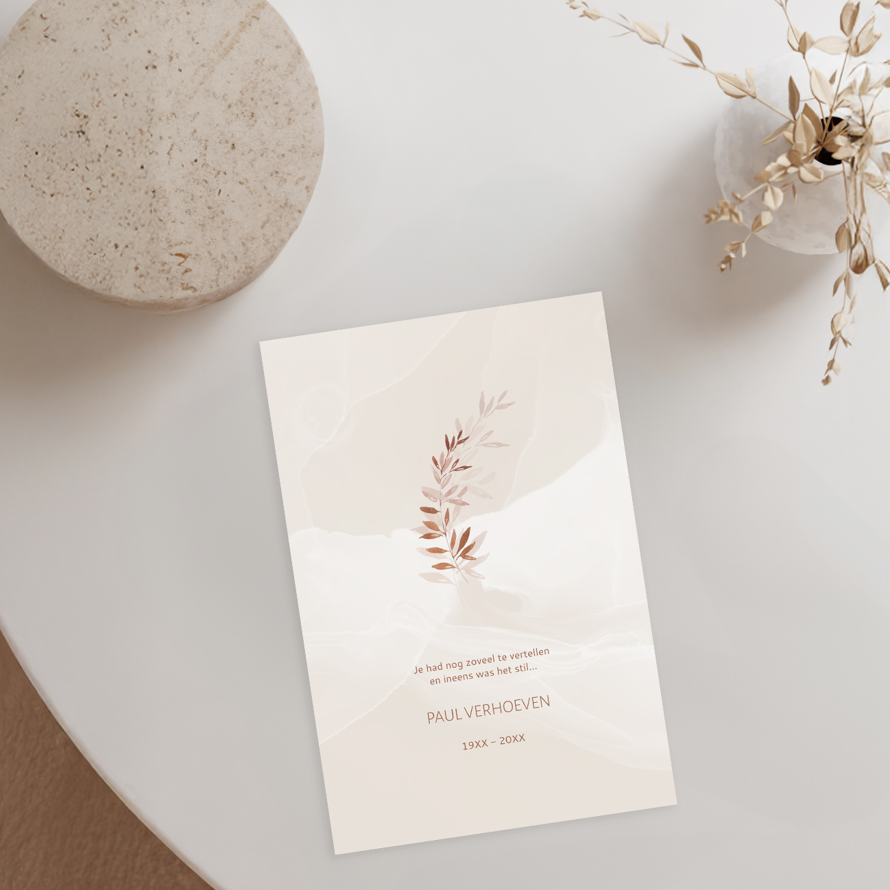 Stijlvolle rouwkaart met takje en watercolour in roestkleuren