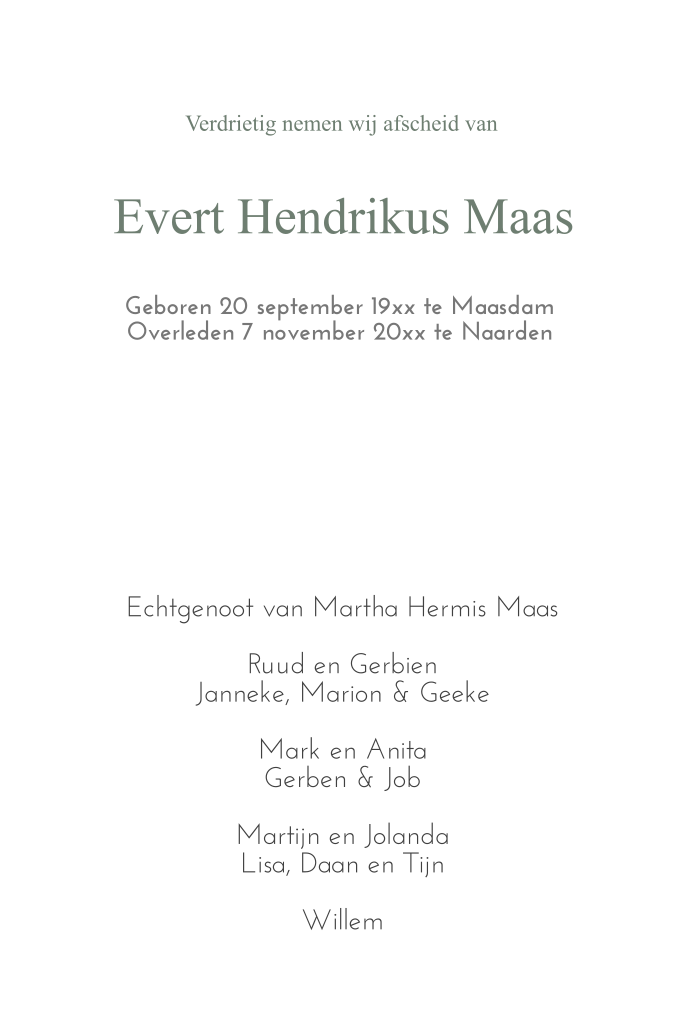 Maak samen met je familie een rouwkaart om familie en vrienden uit te nodigen voor het afscheid. In onze editor pas je online eenvoudig teksten aan. Je hebt keuze uit verschillende papiersoorten en envelopkleuren.