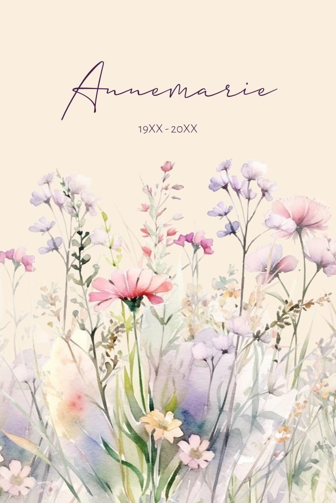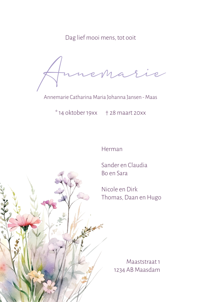Maak een mooie rouwkaart om vrienden en familie uit te nodigen voor het afscheid. Dit rouwkaartje met veldbloemen heeft prachtige pastelkleuren.