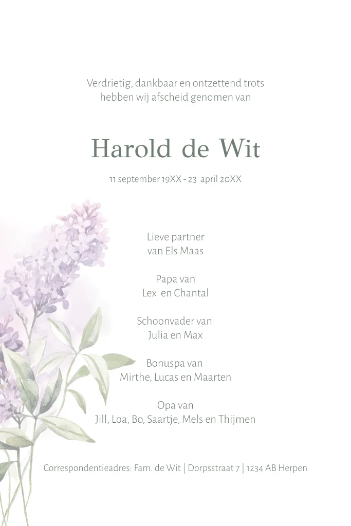 Stijlvolle rouwkaart met paarse seringen en een warme foto. Een liefdevolle herinnering aan een vader, opa of partner die wordt gemist.