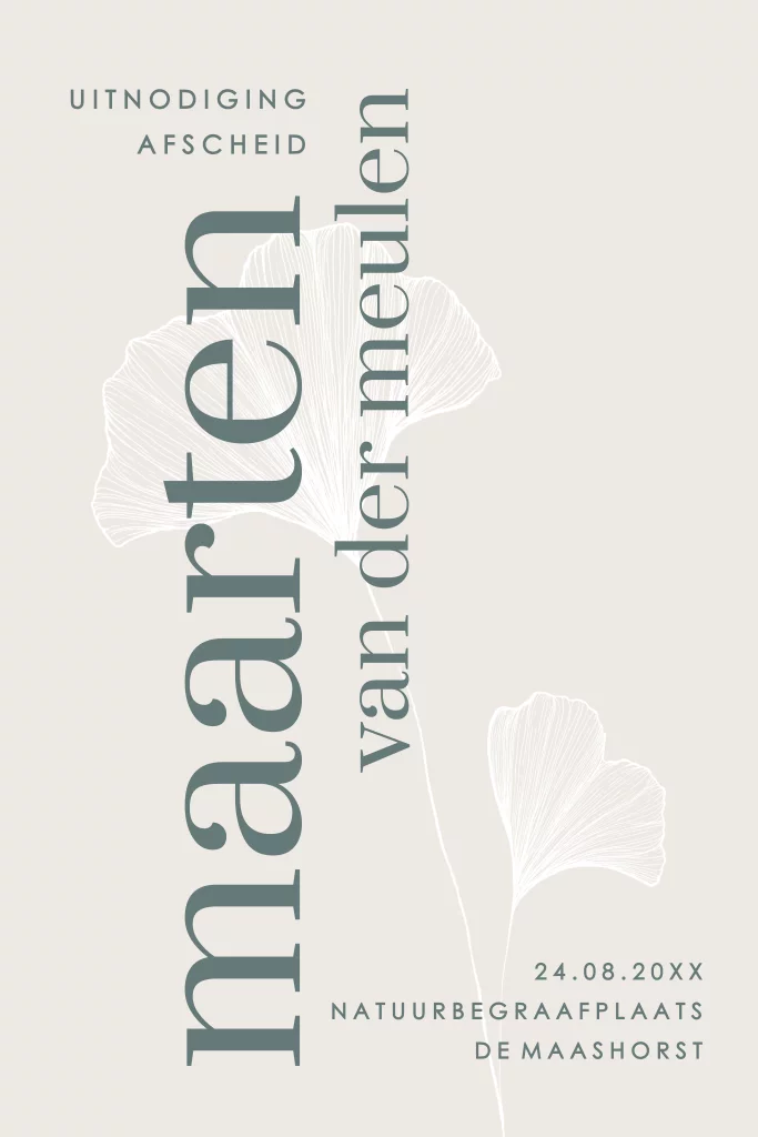 Stijlvol design, modern, alleszeggend, in zijn lievelingskleur. Deze kaart is een prachtige uitnodiging voor een eigentijds afscheid in besloten kring.