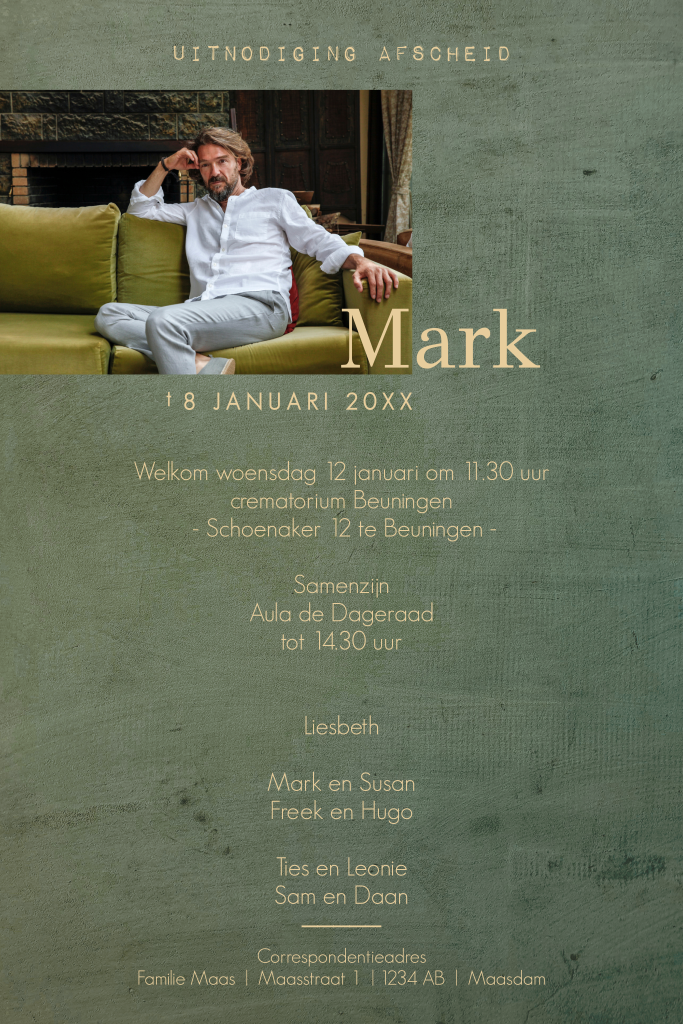Stoer, informatief, no - nonsense. Deze kaart op A5 is een prachtige uitnodiging voor het afscheid. De achtergrond is eenvoudig te vervangen door zijn favoriete kleur. Evenals de portretfoto. Met één klik plaats je de persoonlijke foto.