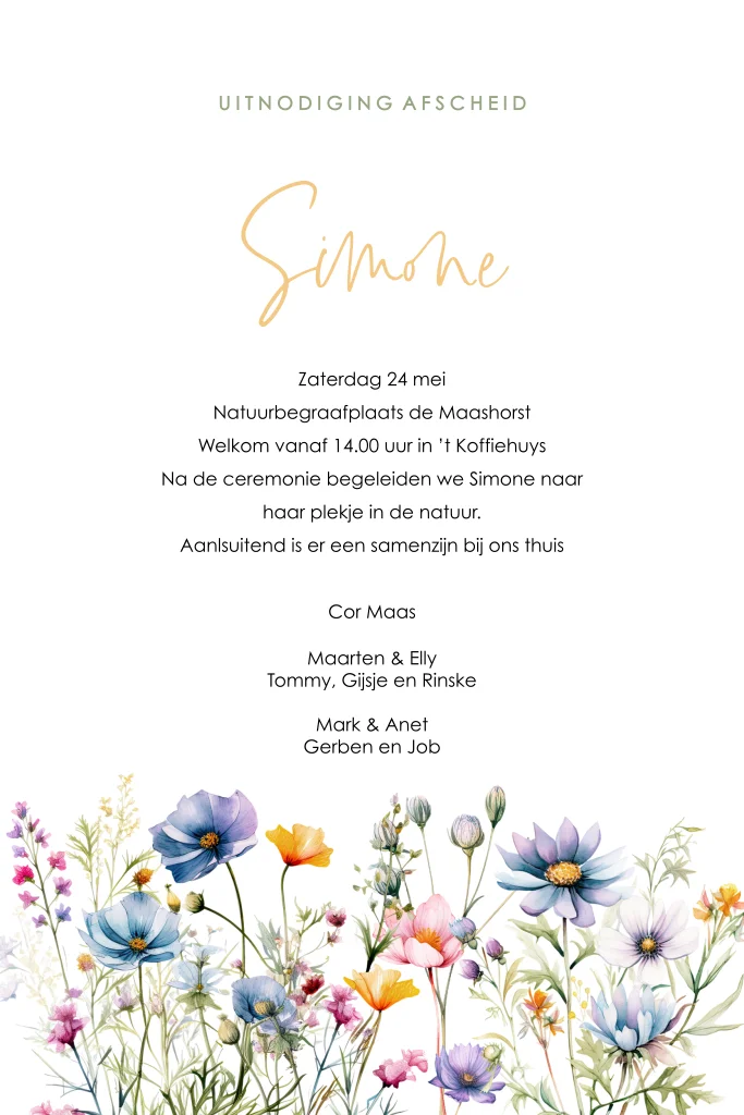 Je dierbare is overleden. In een korte tijd maak je veel beslissingen. Ook de uitnodiging voor het afscheid, de rouwkaart, staat onder tijdsdruk. Wij denken graag met je mee. Wat vind je van deze informele uitnodiging? Op de uitvaart zelf kun je een mooi gedachteniskaartje uitdelen en versturen naar mensen die je gesteund hebben.