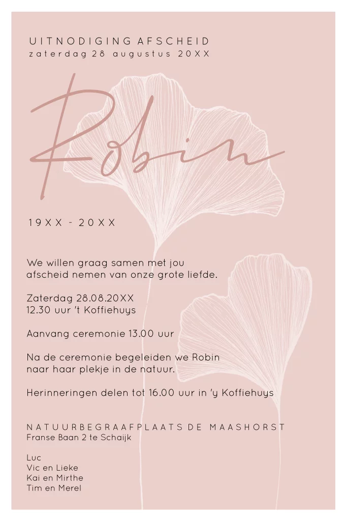 Moderne enkele rouwkaart met ginkgo blad in oud-roze