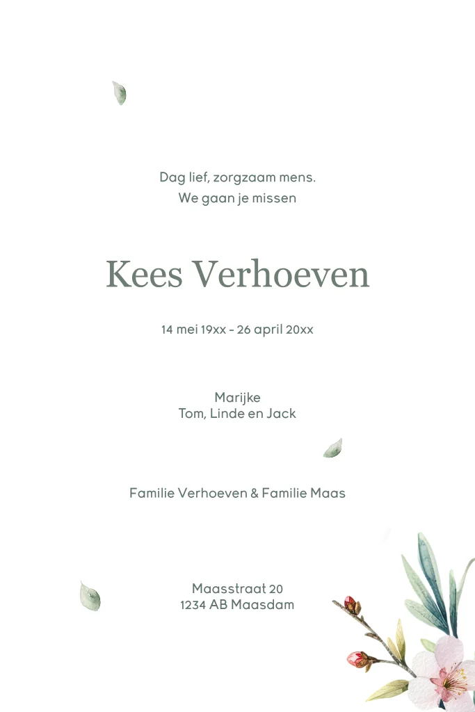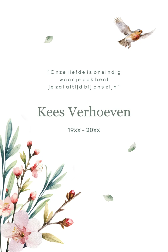 Hield je vader of partner van het voorjaar? Kies voor deze rouwkaart met bloesem en vogel en maak een mooie rouwkaart.