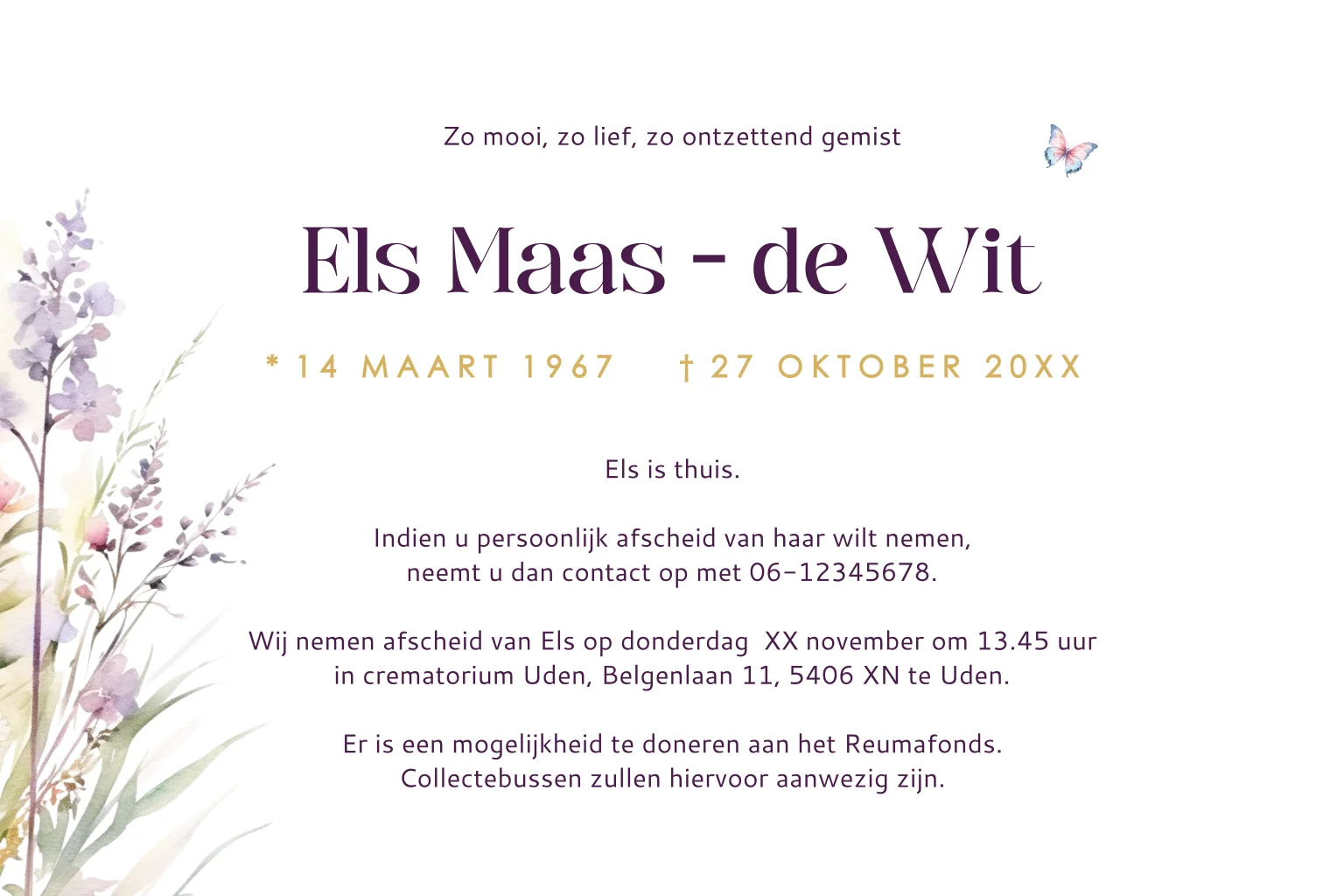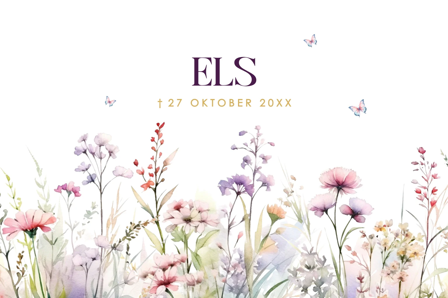 Zelf een rouwkaart maken met bloemen? Kies dit verfijnde ontwerp met aquarelillustraties en vlinders en ontwerp een liefdevolle, persoonlijke kaart.