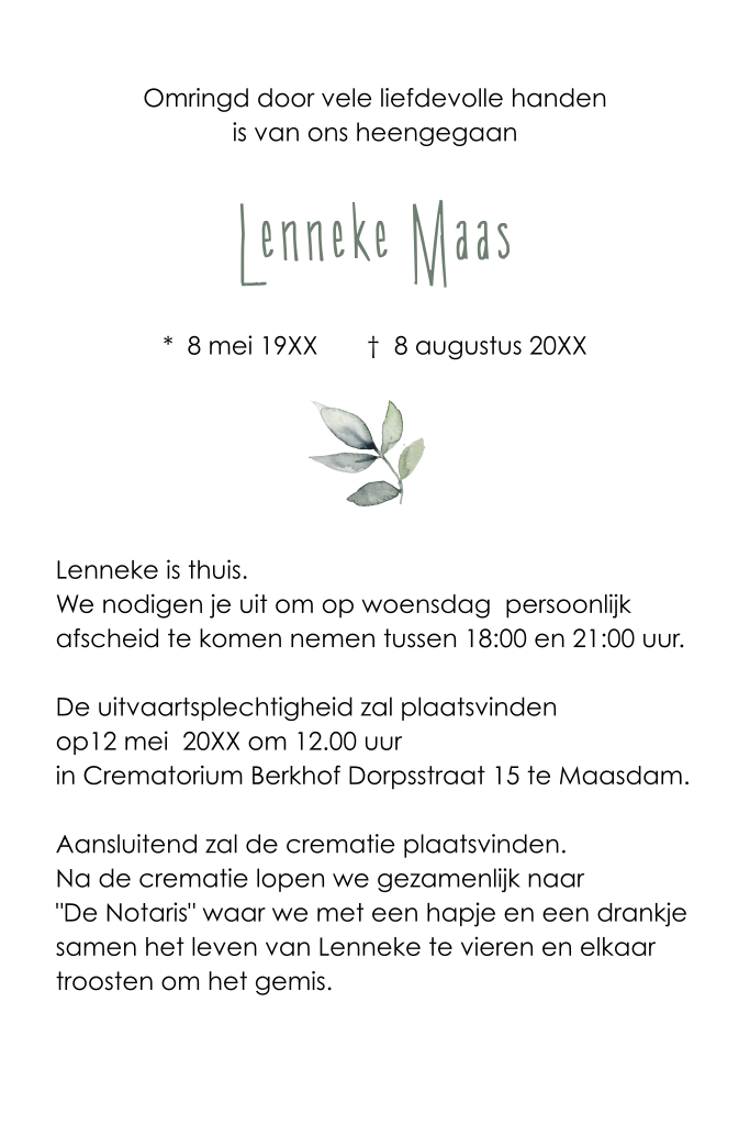 Mooie klassieke rouwkaart met de toevoeging van mooie bloemen. De teksten in deze rouwkaart zijn geheel naar wens aanpasbaar.